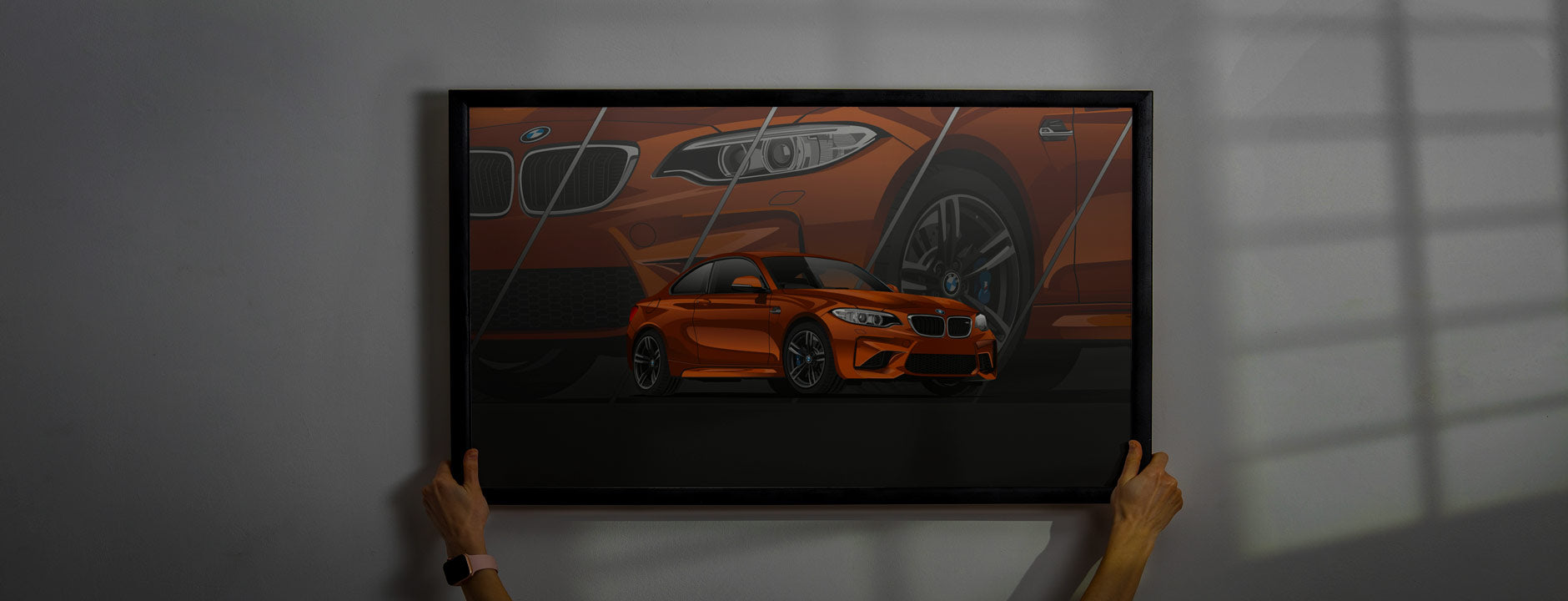 Every artwork is a true hand-crafted piece of digital art. Our talented artists create each portrait in Adobe Illustrator with passion, precision, and an eye for detail. Every line and highlight is drawn by hand – no filters, no apps, and absolutely no AI. Just pure artistry, turning your car into a unique work of art.